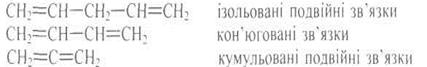 тальні дані підтверджують обчислення: метан має тетраедричну будову, довжина всіх зв'язків С—Н однакова — 0,109 нм, кут між двома будь-якими зв'язками дорівнює 109°28'. Для розривання одного із зв'язків метану потрібно затратити 417,05 кДж∙моль-1 енергії. Саме на цьому грунтувалася теоретична основа тетраедричної моделі атома Карбону, запропонована Я. Вант-Гоффом і Ж. Ле Белем на основі експериментальних даних. Отже, ковалентні зв'язки характеризуються не тільки довжиною зв'язку та енергією, а й кутом між зв'язками. ПОДВІЙНІ КАРБОН-КАРБОНОВІ ЗВ'ЯЗКИ Ненасичені сполуки можуть містити один або кілька подвійних зв'язків, у цьому разі їх відносне розміщення має принципове значення. Якщо між подвійними зв'язками міститься хоч один sр3-гібридизований атом Карбону, то такі системи називаються ізольованими подвійними зв'язками, якщо два атоми Карбону, від кожного з яких виходять подвійні зв'язки, сполучені простим δ-зв'язком, то кажуть про кон'юговані подвійні зв'язки або кон'юговану систему. Якщо два подвійні зв'язки виходять від одного атома Карбону, то такі зв'язки називаються кумульованими подвійними зв'язками: