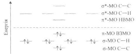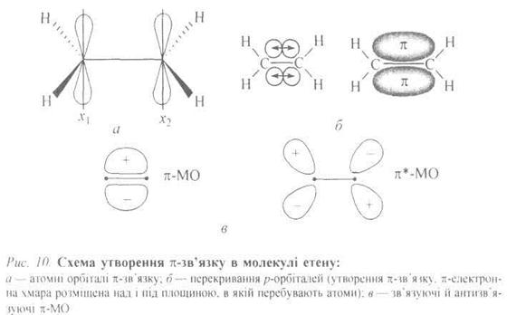 У зв'язуючій π-МО наявна вузлова площина, яка збігається з площиною скелета σ-зв'язків. Така орбіталь розміщується над і під площиною молекули, в якій перебувають два атоми Карбону і чотири атоми Гідрогену. Порівняно з σ-МО, в якій немає такої вузлової площини, енергія π-МО вища, ніж енергія σ-МО (енергія МО зростає зі збільшенням вузлових площин). Антизв'язуюча π*-МО має, крім того, ще одну додаткову вузлову площину, перпендикулярну до осі х, що зумовлює збільшення енергії π*-МО. Енергетичні рівні основного стану етену (етилену) можна подати так:
