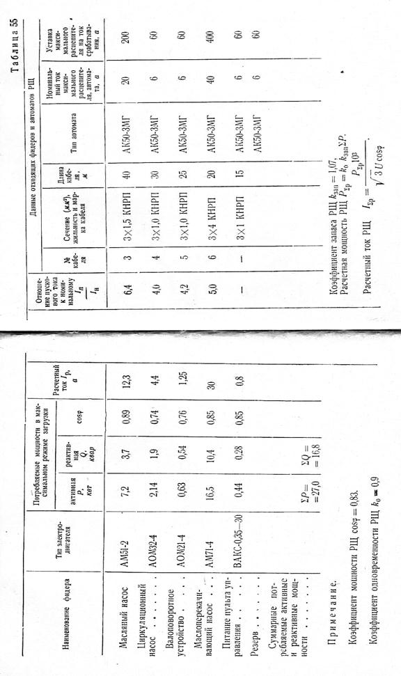 Ниже приводим примерный расчет сечения кабелей и потерь напряжения на участках судовой электрической сети переменного трехфазного тока, изображенной на рис. 117. Расчет выполняется в следующем порядке: по таблице электрических нагрузок генераторов судовых электростанций устанавливаем режим, в котором потребители электрической энергии, подключенные к РЩ, имеют максимальную нагрузку; по значениям максимальных потребляемых мощностей потребителями определяем расчетный ток фидеров РЩ; по величинам расчетных токов каждого фидера РЩ выбираем сечение кабеля по таблицам допустимых нагрузок для однорядной прокладки кабелей; сечение питающего кабеля РЩ определяем по суммарному расчетному току всех подключенных потребителей РЩ с учетом коэффициентов одновременности k0 и запаса kзап, т. е. ІΣ Р. Коэффициент запаса учитывает увеличение загрузки питающего фидера РЩ за счет подключения в дальнейшем к запасному фидеру потребителя; по величине полного расчетного тока ІΣ Р по таблицам допустимых нагрузок на кабели выбираем сечение кабеля питающего фидера РЩ; по заданной мощности генератора определяем полный расчетный ток и соответственно сечение кабеля от генератора до ГРЩ;