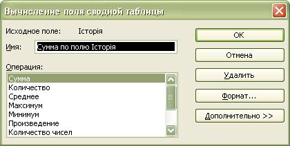 1.2.5. Для створення підсумкового звіту «Підсумки за величиною стипендії». Для цього перетягніть поле Прізвище на позначку Страница, рядками майбутнього звіту раціонально визначити Прізвище, ім’я, по батькові, на поле Столбец перетягуємо Стипендія, в середину прямокутника Данные затягніть по черзі Середній бал, Загальний бал. Зверніть увагу, що під час переміщення в середину прямокутника Данные, назва кожного з полів замінюється на Всього по полю… Якщо Вас не влаштовує функція підсумовування, її можна замінити на іншу статистичну функцію шляхом подвійного клацання на зображенні відповідного статистичного параметра в прямокутнику Данные. Вигляд вікна керування способом статистичної обробки вихідних данних показаний на рисунку: