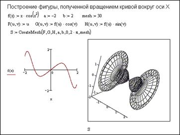 Еще одна новинка системы Mathcad 2000, отсутствующая в предшествующих версиях, это новая графическая функция для задания поверхностей: Эта функция возвращает массив из трех матриц, представляющих координаты переменных x, y и z для функции F, определенной в векторной параметрической форме в качестве параметров sgrid и tgrid. Параметры s0, s1, t0, t1 задают пределы изменения переменных sgrid и tgrid. Параметр fmap - трехэлементный вектор значений, задающий число линий в сетке изображаемой функции. Все аргументы F не обязательны. Создаваеиый функцией CreateMesh массив можно использовать для ввода в шаблон трехмерной графики типа Surface Plot. Пример применения функции CreateMesh - построение объемной фигуры, которая получается вращением кривой, заданной функцией f(х), вокруг оси Х или Y. На рис.8.23 показан пример решения данной задачи. Слева на рис.8.23 показана исходная кривая, заданная функцией f(x), а справа дано построение объемной фигуры с применением форматирования для повышения наглядности графика.