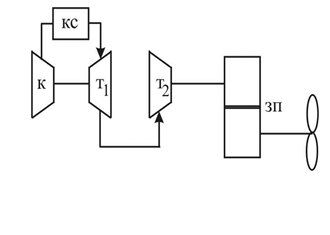 При цьому 70¸75% потужності, що розвивається турбіною, витрачається на обертання компресора, а 25¸30 – через зубчасту передачу (ЗП) і валопровід передається гвинту. З турбіни гази, що відробили, викидаються в атмосферу, де вони охолоджуються при атмосферному тиску до температури повітря. Тим самим замикається термодинамічний цикл. Запуск ГТУ робиться за допомогою спеціального електричного двигуна (стартера), паливо в період запуску запалюється від електросвічі. Такі агрегати, як правило, використовуються для привода електрогенераторів. На сучасних кораблях застосовуються ГТУ, що мають наступні схеми: а) двовальна схема: