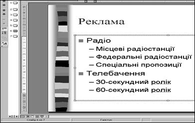 1.3.1. Шрифт, маркери і відступи абзаців Основними текстовими елементами презентацій є списки. На відміну від Word списки PowerPoint завжді передбачаються багаторівневими, що вносить деяку специфіку в прийоми їхнього форматування. Щоб прикрасити списки презентації, створеної на попереднім занятті, виконаємо наступні кроки. 1. Відкрийте презентацію План_Прізвище.ррt 2. Щигликом на кнопці (Режим слайдов) розгорніть слайд на усе вікно PowerPoint. 3. Декількома натисканнями клавіші Page Down перейдіть до шостого слайда Реклама, показаному на рис. 1.30. На цьому слайді розташований дворівневий список. 4. Щоб вивести на екран лінійки (якщо такі відсутні), виберіть команду (Вид > Линейка). 5. Клацніть у межах списку. Навколо списку з'явиться рамка габаритного контейнера із шістьма маркерами, а на лінійках з'являться границі габаритного контейнера і повзунки відступів пунктів списку першого і другого рівнів.