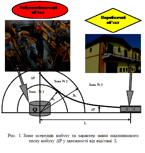 УМОВИ. В промисловій зоні на відстані L від виробничого приміщення (цеху) розташований об'єкт, на якому знаходяться Q тонн вибухонебезпечної речовини (газу-пропану). Під час можливої аварії з вибухом цех може опинитись в осередку ураження. ЗАВДАННЯ. Оцінити можливі наслідки впливу на виробниче приміщення аварії на вибухонебезпечному об'єкті відповідно до вихідних даних заданого варіанту. ВИЗНАЧИТИ: 1. Зону руйнувань, в яку може потрапити цех. 2. Ступінь руйнування елементів цеху. 3. Очікуваний характер пожеж в районі розташування цеху. 4. Ступінь можливого ураження виробничого персоналу. 5. Зробити висновки і сформулювати рекомендації. 2.1 Визначення ступеню руйнувань під час вибуху Ступінь руйнувань будівель, споруд, обладнання залежить від їх конструктивної міцності та величини надлишкового тиску (ΔР) ударної хвилі. Величина надлишкового тиску, в свою чергу, визначається кількістю вибухової речовини (Q) і відстанню від досліджуваної точки до центру вибуху (L). Під час вибуху газоповітряної суміші вуглеводневих продуктів створюється осередок вибуху, який поділяють на три зони (дивись рисунок 1, с. 82). Зона 1 — зона детонаційної хвилі (знаходиться в межах хмари вибуху) має радіус R1: R1 = 17,5 де Q, (тон) - кількість вуглеводневого продукту.