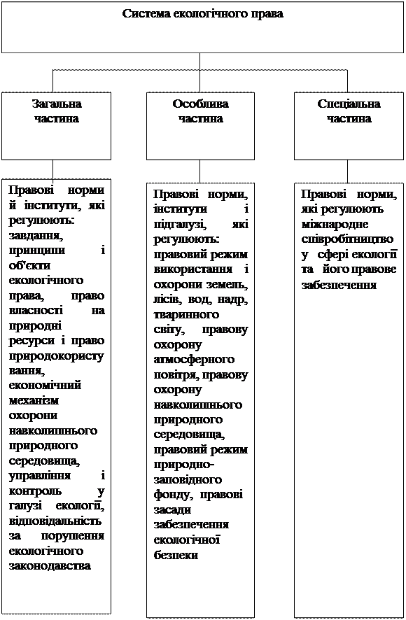 ЗАПИТАННЯ ДЛЯ САМОКОНТРОЛЮ 1. Що таке навколишнє природне середовище (довкілля)? 2. З яких частин складається курс екологічного права? 3. Назвіть основні нормативні акти в сфері екологічного права. 4. Які наукові установи здійснюють вивчення екологічних проблем? 5. Дайте визначення екологічному моніторингу довкілля. 6. Що є предметом екологічного права? 7. Дайте визначення екологічним правовідносинам. 8. Що таке система екологічного права? 9. Назвіть основні гарантії екологічної безпеки в Україні. 10. Назвіть основні екологічні права та інтереси громадян. 11. З якою метою здійснюється управління в галузі екології? 12. Назвіть види державного управління. 13. Які види юридичної відповідальності встановлено за порушення норм охорони навколишнього природного середовища. 14. Визначте зміст екологічної безпеки. 15. Порівняйте поняття «ризик» і «екологічний ризик». 16. Які існують служби запобігання і реагування на аварії, катастрофи, інші надзвичайні ситуації? 17. Дайте визначення поняттю «зона надзвичайної ситуації». 18. Дайте визначення поняттю «землеустрій». 19. Назвіть категорії земель. 20. Дайте визначення земельному сервітуту. 21. Які категорії користувачів звільняються від плати за користування надрами? 22. Які відомості містить державний кадастр? 23. Назвіть складові лісового фонду. 24. Які лісові ресурси належать до державного значення? 25. Які лісові ресурси належать до місцевого значення? 26. На кого покладається забезпечення охорони та захисту лісів? 27. Назвіть об’єкти тваринного світу. 28. Назвіть види використання об’єктів тваринного світу. 29. Які органи здійснюють управління в галузі використання, відтворення та охорони тваринного світу? 30. Що таке рекреаційна зона? Які природні ресурси можуть виконувати рекреаційну функцію? 31. До якої форми власності можуть належати землі рекреаційного призначення?