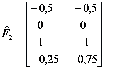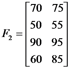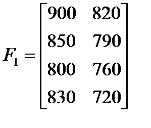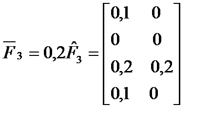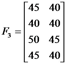 ► Приклад 5.6. Фірма має можливість реалізувати свою продукцію на одному із 4-х ринків. При цьому одночасно ставляться такі цілі: максимізація прибутку (тис.грн.), мінімізація затрат на рекламу (тис.грн.), завоювання максимальної частки ринку (%). Кон’юнктура ринку для кожної цілі може перебувати у двох станах – сприятливому і несприятливому, а оцінки стратегій щодо вибору ринку для кожної цілі задані відповідно за допомогою матриць