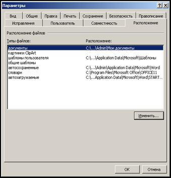 2). Відкрийте вкладку Росположение, виділіть елемент Шаблоны пользователя і натисніть кнопку Изменить. 3). З’явиться діалогове вікно, в якому потрібно вказати нове розташування папки з шаблонами. Word використовує формат зберігання шаблонів, сумісний з форматами попередніх версій.