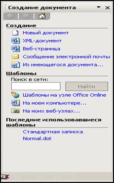 7.5. Створення документів з використанням шаблонів Для створення нового документа на основі шаблону необхідно: 1). Вибрати команду Файл Þ Создать, після чого з’явиться Область задач, в якій буде відображена вкладка Создание документа (мал. 7.3); 2). Вибрати команду На моем компьютере в групі Шаблоны на вкладці Создание документа. З’явиться діалогове вікно Шаблоны (мал.7.4); 3). Розкрити вкладку Общие і виділити значок Новый документ. Цей значок відкриває шаблон звичайного документа (Normal.dot). 4). Якщо необхідно створити документ на базі будь-якого стандартного шаблону, відмінного від шаблону звичайного документа, необхідно розкрити потрібну вкладку і виділити значок шаблону. У групі Просмотр виводиться приклад документа, що створюється на базі виділеного шаблону. 5). У групі Создать встановити перемикач Документ. 6). Натиснути кнопку < ОК>.