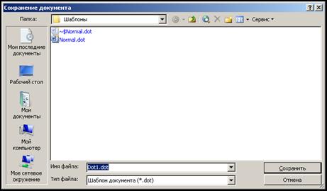 Щоб створити шаблон на основі існуючого звичайного документа необхідно: 1). Відкрити документ, який потрібно використовувати як основу для нового шаблону; 2). Змінити документ потрібним чином, відредагувавши текст, додавши графіку, стилі, елементи автотексту або кнопки на панелі інструментів; 3). Вибрати команду Файл Þ Сохранить как. З’явиться діалогове вікно Сохранение документа (мал. 7.6); 4). У списку, що розкривається, Тип файла виділити елемент Шаблон документа; 5). Ввести ім’я шаблону в полі Имя файла. Розширення dot буде додане автоматично; 6). Натиснути кнопку < ОК>.