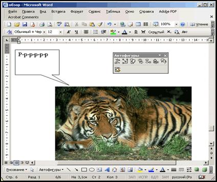 На вкладках діалогового вікна можна вибрати параметри форматування об’єкта: · Цвета и линии – вибір стилю обтікання і вибір кольору і способу заливки, кольору, типу та товщини лінії; · Размер – зміна розміру, масштабу і кута повороту; · Положение – вибір стилю обтікання і вирівнювання по горизонталі; · Рисунок – тільки для малюнків – обрізання малюнків, вибір їх кольору, яскравості та контрастності; · Надпись – тільки для напису – зміна заливки між текстом і рамкою напису. Автофігури – це нескладні графічні об’єкти, які зручно використовувати в текстах. До них відносяться різного роду зірочки, півмісяці, квіточки тощо. Їх може „намалювати” будь-який користувач, оскільки вони вже намальовані і пропонуються в готовому вигляді. Коли ви додаєте графічний об’єкт чи малюнок у текст, він розташовується на спеціальній підложці, або полотні. Полотно зручно використовувати при вирівнюванні об’єктів. Ті прийоми малювання, що пропонує Word, частіше всього не вимагають полотна взагалі. Для того щоб полотно не з’являлося в тексті під час вставки графічного об’єкта чи малюнку необхідно виконати команду Сервис Þ Параметры, і у вкладці Общие вилучити прапорець атоматически создавать полотно при вставке автофигур. Щоб вставити необхідну (або просто цікаву) автофігуру, виберіть команду Вставка Þ Рисунок Þ Автофигуры. На екрані з’явиться панель інструментів Автофигуры, а текст перейде в режим Разметка страницы (якщо ви працювали в режимі Обычный ). Кожна кнопка панелі інструментів Автофигуры має вигляд меню, яке відкривається. Якщо вибрати одну з них покажчик миші перетвориться на великий знак „плюс”. Тепер можна „намалювати” цю фігуру в тексті, перетягнувши курсор миші. З’являється фігура в певній точці, причому певного розміру. Потім і її розташування, і розмір можна буде змінити. (див. мал. 8.7).