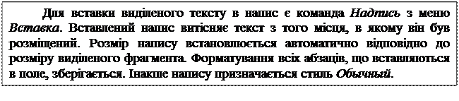 Перед вставкою порожнього напису слід переконатися, що документ не містить виділених абзаців. Потім потрібно викликати команду Надпись з меню Вставка (можна також скористатися панеллю інструментів Рисование), становити покажчик миші в тому місці сторінки, де повинен знаходитися лівий верхній кут поля, і при натиснутій лівій кнопці миші задати розміри поля. Після вставки текстового поля на екрані з’являється панель інструментів Надпис (див. мал. 8.12). Опис кнопок панелі інструментів Надпис наведенийу таблиці 8.1.