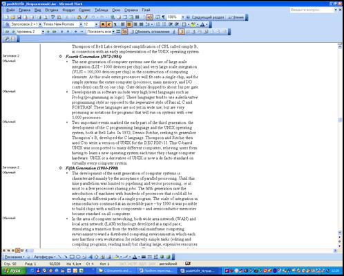 Мал. 9.1. Вікно документа Word у режимі перегляду структури документа Мал. 9.2. Панель інструментів Структура Ліворуч від кожного абзацу знаходиться відповідний йому символ структури. Символи структури бувають двох видів: · символи заголовків – "+" і "-"; · символ основного тексту – £. Символ "+" ліворуч від заголовка означає, що у відповідному розділі міститься текст. Знак "-" говорить про те, що розділ порожній. Використовуючи ці символи, можна проводити деякі операції над структурою тексту документа. Зміст розділів можна тимчасово приховати за допомогою символу структури "+". Для цього треба виконати подвійне натискання цього символу біля відповідного заголовка. Для вказівки кількості рівнів структури, що відображаються, клацнути на одній із кнопок Показать уровень1,... Показать уровень9. Цифра на кнопці відповідає самому найменшому рівню заголовка, що відображається. У цьому режимі показуються тільки назви розділів, без основного тексту. Для відображення основного тексту слугує кнопка Все уровни на тій же панелі інструментів. Якщо натиснути цю кнопку, структура тексту документа буде показана цілком. Щоб показати всі заголовки, а основний текст приховати, необхідно ще раз натиснути кнопку Все уровни. Часто формат заголовків, особливо старших рівнів, відрізняється великим розміром шрифту. Такі заголовки займають багато місця на екрані й у режимі перегляду структури сильно утрудняють сприйняття, оскільки на екран уміщається тільки кілька розділів. Можна зменшити масштаб відображення тексту, але в такому випадку нелегко розрізнити основний текст і заголовки молодших рівнів.