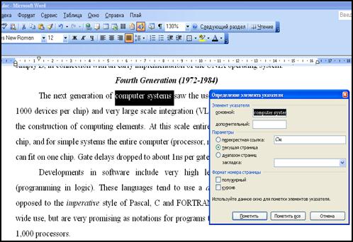 Мал. 9.5. Діалогове вікно Определение элемента указателя залишиться відкритим після натиснення кнопок Пометить або Пометить все. Для вибору нових елементів покажчика треба продовжити перегляд документа та позначати наступні елементи. 6). Натиснути кнопку Закрыть після визначення всіх елементів предметного покажчика, котрі повинні увійти до складу покажчика. При натисненні кнопки Непечатаемые знаки на панелі Стандартной вміст поля {ХЕ} після слів у тексті документа прийме схований вигляд.