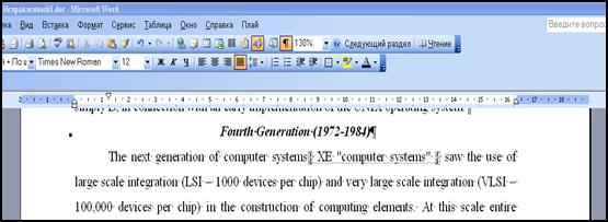 Після натиснення кнопки Пометить або Пометить все в тексті документа після виділеного слова вставляється код поля {ХЕ}(index Entry). Вміст даного поля є схованим текстом, але він відтворюється на екрані (див. мал. 9.5), оскільки автоматично встановлюється прапорець Все в групі Знаки форматирования на вкладці Вид діалогового вікна Параметры, що відкривається командою СервисÞ Параметры.