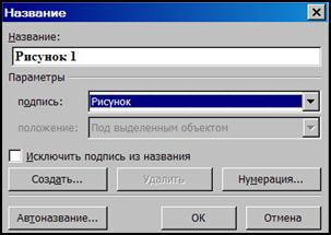 1). Вибрати команди: ВставкаÞСсылкаÞ Название. З’явиться діалогове вікно Название (див. мал. 9.7); 2). Натиснути кнопку Автоназвание. З’явиться діалогове вікно Автоназвание (див. мал. 9.10);