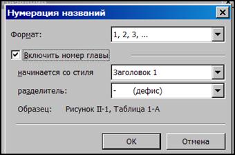 4). У розкриваючому списку Положение вибрати, як назва буде розміщуватися відносно виділеного об’єкта; 5). Для уточнення параметрів нумерації назв за допомогою кнопки Нумерація… відкрити діалогове вікно Нумерация названий (див. мал. 9.9); 6). У розкриваючому списку Формат вибрати необхідний варіант нумерації; 7). При наявності в тексті нумерації заголовків необхідно у склад номера назви включити номер заголовків, встановивши прапорець Включить номер раздела, і у списку Начинается со стиля вибрати стиль заголовку, який буде враховуватися при визначенні номера назви малюнка; 8). У розкриваючому списку Разделитель указати символ, наприклад, крапку, для відокремлення номера заголовка від номера малюнка в назві; 9). Натиснути кнопку ОК.