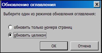 Для поновлення змісту документа необхідно: 1). Установити курсор ліворуч від списку та натиснути на клавішу <F9>. На екрані з’явиться діалогове вікно Обновление оглавления (див. мал. 9.13); 2). Вибрати спосіб поновлення. Встановити перемикач Обновить только номера страниц, якщо імена заголовків не змінювалися. Щоб виконати повне поновлення змісту, необхідно встановити перемикач Обновить целиком.
