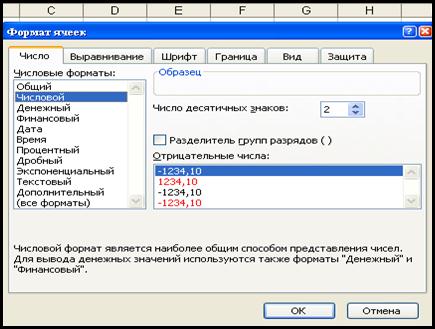 Щоб змінити формат представлення даних у комірці, необхідно: виділити комірку і виконати команду Формат Þ Ячейки. З’явиться діалогове вікно Формат ячеек (див. мал. 11.5); вибрати вкладку Число; у списку виділити потрібну категорію формату та підібрати до нього необхідні параметри: · Числовой – якщо потрібно задати конкретні деталі відтворення чисел (число десяткових знаків, роздільник груп розрядів або спосіб відтворення чисел); · Денежный або Финансовый формат – для відтворення грошових сум (різниця між цими форматами в тому, що формат Денежный дозволяє відтворювати від’ємні суми, наприклад, іншим кольором і без знака мінус і робити вирівнювання значень у комірці); · Процентный – для відтворення чисел у відсотках; · Экспоненсиальный – для відтворення числа (як правило, досить великого або, навпаки, досить маленького) у вигляді добутку двох складових – числа, що знаходиться в межах від 1 до 10, і ступеня числа 10 (позитивного або негативного);