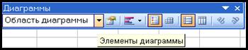 Додавати нові або змінювати параметри існуючих елементів діаграм можна за допомогою панелі інструментів Диаграмма, контексного меню елементів діаграми та покажчика миші. встановлюється на екран автоматично при виділенні діаграми. Зліва на панелі розташований випадаючий список Элементы диаграммы, що містить елементи діаграми, які можна виділяти і змінити їх властивості: