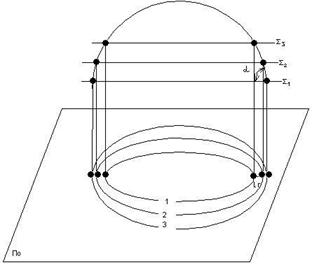 Топографічну поверхню розтинають січні площини рівня S1, S2, S3, які розташовані на відстані 1, 2, 3 м від П0. результатом перетину топографічної поверхні січними площинами будуть замкнуті лінії – горизонталі, які мають відповідні числові позначки. Вершина ЧП числа вказує на Рис. 16.1 напрям зростання ЧП горизонталей. ЧП приводять в розриві горизонталі. Відстань між суміжними горизонталями є інтервал закладання горизонталей lг. Відстань між січними площинами ∆h – висота перерізу. Кут нахилу бокової поверхні - α. lг= ∆h*ctg α. Топографічні поверхні широко використовуються в топографії, картографії, а також при рішенні окремих задач гірничих креслень. Топографічні поверхні мають наступні характеристики: 1) кінченність – кожна точка ТП має свою ЧП, яка не може бути величиною нескінченно великою або нескінченно малою; 2) однозначність – кожній парі координат x, y відповідає тільки одна координата z (ЧП); 3) неперервність – кожному прирощенню координат x, y відповідає аналогічне прирощення координати z; 4) плавність – лінії, за допомогою яких задають ТП на кресленні мають плавні окреслення. 2. Визначення меж земляної споруди. Рішення цієї задачі зводиться до побудування верхньої бровки виїмки та нижньої бровки насипу. Розглянемо конкретний приклад. Приклад. Визначити межі земляного майданчика довжиною 18 м, шириною 12 м, ЧП=50м, нахил укосу насипу ін=2:3, нахил укосу виїмки ів=1:1, масштаб креслення 1:200, тобто 1см = 2м.