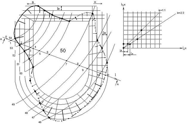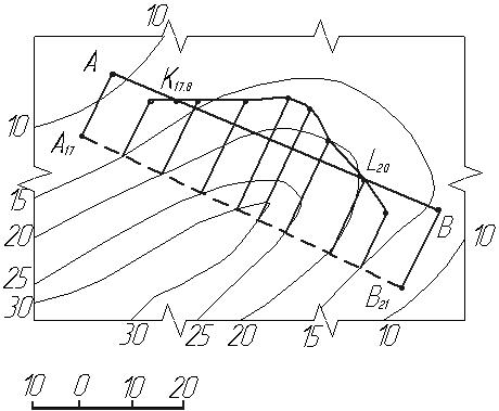 Рис. 16.2 Рис. 16.3 План рішення. 1) Визначають напрям виїмки та насипу від точок перетину 50-ої горизонталі рельєфу з контурами майданчику. Виконують аналіз ЧП рельєфу вліво та вправо від 50-ої горизонталі (рис. 16.2). 2) Будують графік інтервалів закладання на основі івиїмки та інаипу та лінійного масштабу (рис. 16.3). 3) З графіків інтервалів закладання визначають інтервали закладання горизонталей укосів виїмки та насипу (рис. 16.3). 4) Використовуючи lв, будують паралельно до контурів майданчика горизонталі укосу виїмки, ЧП яких будуть збільшуватися по мірі віддалення від контурів майданчика (рис. 16.2). 5) Позначають точки перетину однойменних горизонталей укосу виїмки та рельєфу поверхні, які з’єднують товстою кривою лінією (рис. 16.2). 6) Отримана лінія – верхня бровка, контури майданчика - нижня. Верхню та нижню бровки з’єднують лініями найбільшого схилу. Відстань між ними приблизно 0,3 закладання (рис. 16.2). 7) Наносять бер-штрихи, які вказують на положення верхньої бровки виїмки (товсті лінії, які проводять між лініями найбільшого схилу, їх довжина приблизно 0,5 закладання) (рис. 16.2). 8) Використовуючи lнасипу, будують паралельно до контурів майданчика горизонталі укосу насипу, їх ЧП будуть зменшуватися по мірі віддалення від контурів майданчика. Подальше побудування виконують аналогічно до побудування верхньої бровки виїмки, крім того, що положення нижньої бровки насипу позначають тонкою штрих-пунктирною лінією (яка може змінити своє положення на плані) (рис. 16.2). 3. Побудування вертикального розрізу. Положення січної площини приводять на плані земляної споруди. Побудування розрізу виконують в наступній послідовності (рис. 16.4). 1) На вільному місці будують дві перпендикулярні шкали l, h. 2) На плані визначають інтервал ЧП, в якому необхідно виконати градуювання шкали h. На шкалі h в масштабі креслення виконати градуювання через 1м. Шкала l розташована на сліді січної площини А-А на плані земляної споруди. 3) На плані позначають точки перетину шкали l з горизонталями рельєфу та конурами майданчика. 4) По шкалі l послідовно будують кожну точку і піднімають її на відповідну ЧП по шкалі h. Всі відстані між точками виміряють по шкалі l, що на плані співпадає з площиною перерізу. 5) 6) Положення земляної поверхні на кресленні Рис. 16.4 приводять наступним чином. Положення насипу умовно зображають точками. Позначають розріз А-А. 4. Перетин прямої та топографічної поверхні. Результатом перетину прямої та топографічної поверхні є дві точки. Для визначення положення яких необхідно. 1) Пряму заключити у допоміжну січну площину. 2) Побудувати накладений переріз ТП січною площиною, використовуючи закладання прямої та лінійний масштаб креслення. 3) Використовуючи ЧП крайніх точок прямої та лінійний масштаб, будують пряму у просторі. 4) Позначити точки перетину прямої та перерізу ТП. 5) Спроектувати точки перетину на закладання прямої та визначити їх ЧП на основі градуювання прямої. Приклад. Визначити точки перетину АВ та ТП (рис. 16.5). 1) А17В21 є ∑і 2) ∑і×ТП=1, 2, 3… 3) 1/, 2/,3/… 4) А/,В/ 5) К, L 6) К17,8, L19,5