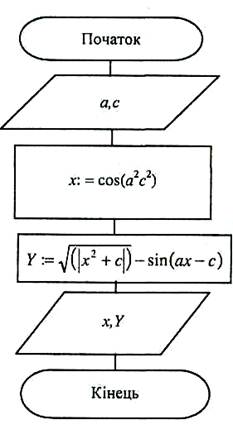 для заданих вхідних значень а, с і х = cos(a2c2). При формалізації поставленого завдання використовується метод покрокової деталізації і з'ясовується, що процес визначення Y розбивається на такі етапи: 1. Визначення вхідних значень змінних а, с. 2. Обчислення виразу х =cos(a2c2). 3. Обчислення виразу 4. Виведення отриманих вихідних значень х та Y. Блок-схема алгоритму розв’язування задачі: