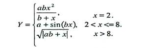 При х > 12 та х = 4 функція не визначена. Етапи розв'язання задачі: 1. Уведення коефіцієнтів а, Ь. 2. Уведення вхідного значення аргументу х. 3. Перевірка значення аргументу х: · Якщо х = 2, то значення Y обчислюється за формулою