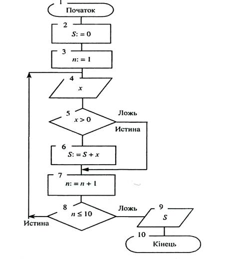 Цикл, що використовується у прикладі, є циклом з передумовою, тому що блок перевірки розташований на початку циклу. Цикл з накопиченням. Серед заданих десяти значень х = {2, 8, 0, -6, -4, 22, 5, -9, 13, —12} обчислити суму додатних чисел. Даний цикл організовується як цикл по лічильнику. Якості змінна — накопичувач суми вибирається змінна S. Перед першим виконанням циклу початкове значення S вибирається рівним нулю (це проводиться з тієї причини, що при додаванні нуля до будь-якого значення результат не зміниться). Етапи розв'язання задачі: 1. Задається початкове значення накопичувача суми S (0). 2. Задається початкове значення лічильника п (1). 3. Уводиться поточне значення х. 4. Проводиться перевірка, чи введене значення х є додатнім. 5. Якщо результатом перевірки умови є ИСТИНА, то провадиться накопичення суми (S + х), і значення лічильника збільшується на одиницю (п + 1). 6. Якщо результат перевірки умови — ЛОЖЬ, то накопичення суми не приводиться (пропускається), і значення лічильника збільшується на одиницю (п + 1). 7. Проводиться перевірка стану лічильника циклу. Якщо значення лічильника перевищує кількість заданих значень х (10), цикл припиняється, і виводиться отримане значення суми. 8. Якщо значення лічильника дорівнює або менше за кількість заданих х (10), цикл повторюється з блоку № 4. Нижче подана блок-схема алгоритму розв'язання задачі.