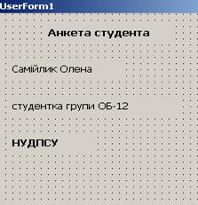 1) Розробка інтерфейсу користувача. Розробимо форму з назвою Анкета. 1.Завантажимо VBA. Створемо форму Insert – UserForm. 2. Поміняемо колір фону форми(BackColor) і дамо назву Анкета (Caption). 3. Вставимо у форму текстове поле (об'єкт типу Label) з текстом "Анкета студента". Задамо значення властивості AutoSize цього об'єкту True і властивості Font (шрифт) цього поля такі: Font: Times New Roman Cyr (або MS Sans Serif); Font style: Bold;: 14; Задайте колір підпису, вказавши значення властивості ForeColor.