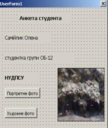Рис.4.1.8. Рис.4.1.9. 4. Аналогічно вставляемо у форму ще декілька текстових полів з біографічними даними. Один з варіантів розміщення текстових полів показаний на рис.4.1.9. 5. Вставимо у форму об'єкт типу Image (малюнок) художню і портретну форографії. Для цього клацніть один раз лівій клавішею миші на піктограмі Image - палітри компонентів і, наприклад, в нижньому правому кутку форми обведіть контур майбутнього зображення (фотографії). У разі потреби поміняйте розмір форми або вставленого об'єкту і добийтеся якнайкращого розташування на ній створених раніше об'єктів. Міняти розміри об'єкту можна методом їх "розтягання" за маркери (чорні габаритні квадратики). За умовчанням цьому об'єкту буде привласнено стандартне ім'я Imagel. Нехай портретна фотографія має назву Imagel,а художня фотографія Image2. 6. Задамоо значення False властивості Visible для обох зображень. 7. Вставимо у форму кнопки для почергового відображення фотографій - два об'єкти типу CommandButton з іменами Соmmandl і Command2. Піктограма об'єкту типу CommandButton (кнопка) знаходиться на палітрі компонентів Visual Basic. Зробіть підписи на кнопках (властивість Caption) "Портретна фотографія" і "Художня фотографія" відповідно. Виберіть якнайкращий, на ваш розсуд шрифт для підписів кнопок. Якщо ви використовуєте картинки із стандартної бібліотеки Clipart, виберіть для кнопок цікаві підписи. Один з варіантів розташування кнопок показаний на рис.4.1.11.