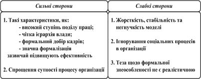Класична теорія організації ґрунтується на результатах досліджень А. Файоля та М.Вебера. А. Файоль сформулював 14 універсальних принципів управління (Тема 2. “Розвиток науки управління”, рис. 2.2, 2.3). М.Вебер в результаті емпіричного аналізу сформулював концепцію ідеальної бюрократії. Вебер розглядав бюрократію як нормативну модель, ідеал, якого мають прагнути всі організації. За Вебером ідеальна бюрократія має наступні основні характеристики: 1) високий ступінь поділу праці - кожна операція повинна виконуватися фахівцем; 2) чітка управлінська ієрархія - кожний нижчий рівень контролюється вищим і підпорядковується йому; 3) численні правила, стандарти та показники оцінки роботи - організація повинна розробити та встановити певний набір правил та стандартів, щоб гарантувати повну єдність виконання робіт; 4) "дух формальної знеособленості" - менеджери повинні управляти бізнесом за відсутності симпатій та переваг щодо окремих працівників; 5) підбір кадрів має здійснюватися виключно за діловими та професійними якостями кожного співробітника. Сильні та слабкі сторони моделі Вебера наведені у табл. 6.1. В центрі уваги неокласичної (поведінкової) теорії організацій знаходиться людина, соціально-психологічні стосунки, індивідуальні та групові взаємозв’язки. Таблиця 6.1 Сильні та слабкі сторони ідеальної бюрократії