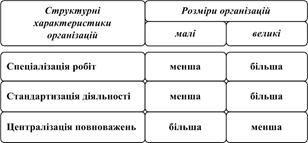 Розміри організації. Вчені Астонського університету з Бірмінгему вивчали широке коло організацій з метою визначення впливу технології та розмірів фірми на її структуру. За результатами своїх досліджень вони прийшли до таких висновків: 1. Технологія чинила сильний вплив на структурні характеристики тільки в малих фірмах. 2. У великих фірмах тісний зв’язок між технологією та структурою зникає. Сильний вплив на структуру у цьому випадку чинили розміри організації. Ключові аспекти впливу розміру організації на її структуру наведені на табл. 6.4. Таблиця 6.4 Вплив розміру організації на її організаційну структуру
