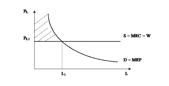 Заробітна плата – це плата за залучення у виробництво трудових послуг. Вона може набувати найрізноманітніших форм: безпосередньо заробітної плати, премії, участі у прибутках фірми, комісійних, винагороди за підсумками року тощо. Однак за своєю суттю – це плата, яку отримує власник ресурсу праці від виробника за надані йому трудові послуги. З певною умовністю винагороду власника трудового ресурсу можна вимірювати тією сумою грошей, яку він отримав, а розмір трудових послуг – часом, протягом якого виробник отримував трудові послуги. Тому надалі термін "заробітна плата" (РL = W ) буде використовуватися для позначення винагороди власника трудових ресурсів за одиницю часу надання трудових послуг. Існує значна розбіжність у рівні заробітної плати для різних країн. Якщо у розвинених країнах середня заробітна плата становить кілька тисяч доларів на місяць, то у країнах з слабкою економікою – кілька десятків доларів. Отже, загальний рівень заробітної плати – це дзеркальне відображення рівня розвитку країни взагалі та рівня продуктивності праці, зокрема. Економіст має розуміти, що реальний дохід власників трудових ресурсів зростає приблизно такими самими темпами, що і продуктивність праці. Оскільки заробітна плата є ціною трудових послуг, то механізм її формування, як це було з'ясовано у попередньому розділі, залежить від моделі ринку. Розглянемо кілька варіантів ринків праці залежно від стану конкуренції на них. Якщо ринок праці конкурентний, то для нього характерна, з одного боку, значна кількість фірм, що конкурують одна з одною при придбанні трудових послуг, а з іншого – чисельна група працівників, які мають однакову кваліфікацію та незалежно один від одного пропонують певний вид трудових послуг. За цих умов ні фірми, ні працівники не можуть контролювати ринкові ставки заробітної плати. Інакше кажучи, фірма погоджується з ціною трудових послуг, що склалася на ринку. Вона може за цією ціною придбати нескінченну (з позиції окремої фірми) кількість трудових послуг. Тому пропозиція праці для окремої фірми на конкурентному ринку матиме вигляд прямої лінії, що відповідатиме ринковій ціні трудових послуг та граничним витратам на цей ресурс. Попит на трудові ресурси для окремої фірми буде визначатися кривою граничного продукту у грошовому вираженні, а тому, на підставі дії закону спадної граничної продуктивності ресурсу, матиме вигляд спадної кривої. До того часу, поки граничний продукт у грошовому вираженні перевищуватиме граничні витрати, фірма буде брати на роботу більше працівників. Вона максимізує свій виграш (заштрихована фігура на рис. 12.1) тоді, коли МRР зрівняється з МRС.
