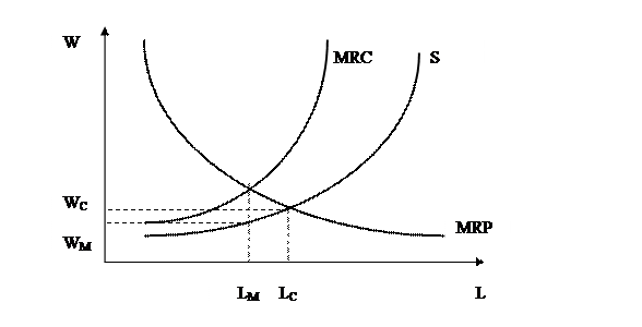На ринку праці досить часто може виникати ситуація, коли монопольне становище займає покупець трудових послуг. Такий ринок називається монопсонією. Він властивий невеликим містам, у яких кількість зайнятих на певній фірмі становить основну частину всіх працюючих. Характерними прикладами можуть бути міста Марганець та Орджонікідзе Дніпропетровської області, де основна частина працюючих зайнята у гірничо-збагачувальній галузі. Оскільки трудові послуги у цьому випадку немобільні, тобто вони не можуть швидко змінити місце проживання чи кваліфікацію, фірма диктує заробітну плату, визначаючи кількість взятих на роботу. Оскільки на ринку монопсонії буде один покупець трудових послуг, то для нього пропозиція збігатиметься з галузевою, тобто її крива матиме зростаючий характер, внаслідок зростання альтернативної вартості ресурсу. Щоб збільшити залучення трудових ресурсів, фірма змушена буде виплачувати більшу заробітну плату. Проте для зняття соціальної напруги більша заробітна плата має сплачуватися не тільки додатковим працівникам, а й тим, що були взяті раніше. Тому для монопсонії граничні витрати на ресурс не збігатимуться із заробітною платою, а завжди будуть вищими за неї. Відповідно крива МRС проходитиме вище, ніж крива S, а точка максимізації прибутку фірми (МRР = МRС) відповідатиме меншій ставці заробітної плати (WM) та меншій кількості взятих на роботу (LM), ніж при конкурентному ринку (рис. 12.2).