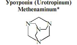 Препарат можна також визначити йодометрично (Ю. П. Китаєв) після осадження тетрайодиду відомою кількістю 0,1 н. йоду. Уротропін застосовують як дезинфекційний засіб при циститах, пієлітах та інших захворюваннях сечових шляхів. Назва препарату походить від грецьких слів: oύpoν– сеча, τpεπεiv – змінювати. Уротропін входить в склад таблеток „к а л ь ц е к с ”, які містять комплексну сіль уротропіну з кальцій-хлоридом та застосовуються при простудних захворюваннях. За кордоном вживають ряд різних солей уротропіну, наприклад, з саліцилатною кислотою (Solurine, Vesalvine S, Urazine), ангідрометиленцитратною кислотою (Formanol, Heimitoi) і т. д. Комплексна сполука уротропіну з натрій-ацетатом називається Cystopurin і Genatosan.