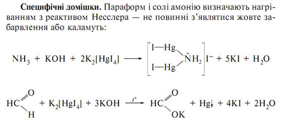 CH3COOH + C2H5OH = CH3COOC2H5 + H2O Аналогічну реакцію дає також метанол (утворення СН3СООСН3). При нагріванні етилового спирту з розчином калій-гідроксиду та декількома краплями 0,1 н. розчину йоду випадає жовтий осад йодоформу (з характерним неприємним запахом): C2H5OH + 4J2 + 4KOH = CHJ3 + 5KJ + HCOOK + 5H2O Аналогічну реакцію дає ацетон, лактатна кислота і ацетальдегід, не дає її метанол. Для виявлення метанолу, як недозволеної домішки, змішують препарат з розчином калій-перманганату та сульфатною кислотою, причому вже на холоді метанол оксидується до формальдегіду: 5CH3OH + 2KMnO4 + 4H2SO4 = 5CH2O + 2MnSO4 + 2KHSO4 + 8H2O Надвишок калій-перманганату через 2 – 3 хв. розкладають оксалатною кислотою та до продукту реакції додають реактив Шиффа (розчин фуксину, знебарвлений сульфітною кислотою).Виникає рожеве або червоне забарвлення.