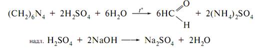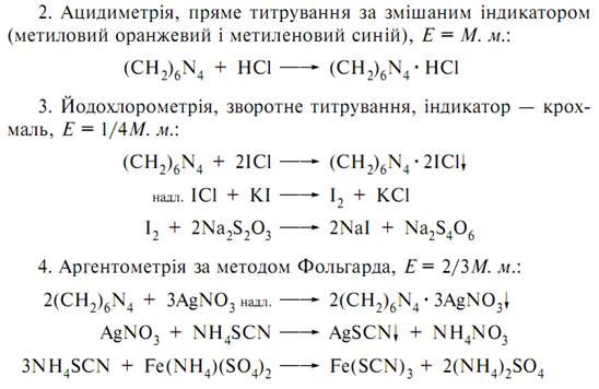 Кількісне визначення: 1. кислотно-основне зворотне титрування, препарат кип’ятять з відомою кількістю 0,1 М розчину сульфатної кислоти до повного видалення формальдегіду, а потім відтитровують надвишок сульфатної кислоти 0,1 М розчином NaOH при наявності метилового червоного: