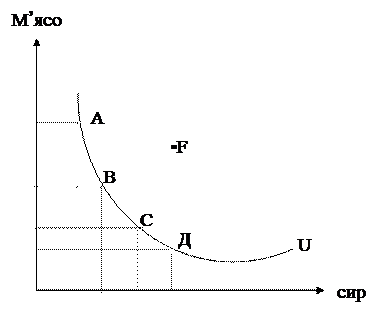 Крива байдужості визначає багато комбінацій м’яса і сиру, які носять однакову с точки зору споживача корисність. Тобто між наборами товарів А, В, С, Д споживач не вбачає ніякої різниці. У зв’язку з цим, слід відмітити, що крива байдужості показує альтернативні набори товарів, які забезпечують однаковий рівень корисності. Набір товарів, що відповідає координатам точки F1 забезпечує більший рівень задоволення споживача ніж будь-який набір, що належить кривій байдужості.
