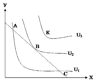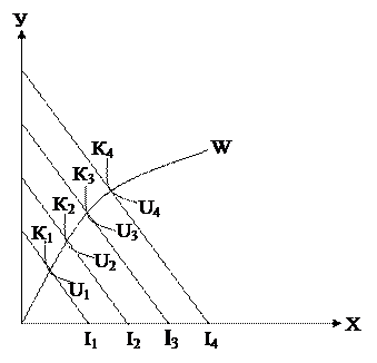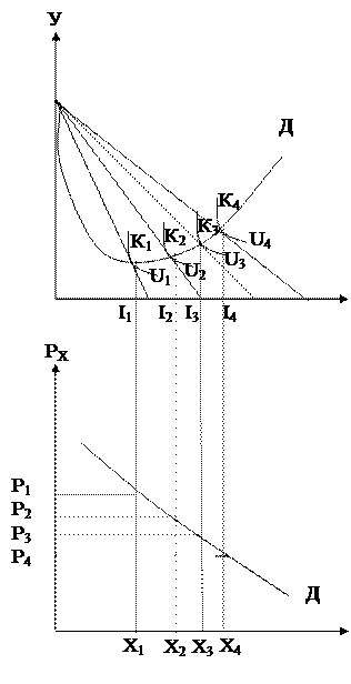 При дослідженні кривої «дохід- споживання» дохід був величиною змінною але ціни були постійними. Передбачимо, що дохід остається величиною постійною, а змінюється тільки ціна одного з товарів. Припустимо, що змінюється ціна блага Х. Визначаючи точки дотику кривих байдужості U1 U2 U3 U4 з бюджетним обмеженням точками К1 К2 К3 К4 поєднуючи їх, ми визначаємо криву “ціна - споживання”. Крива “ціна - споживання” показує, як змінюється обсяг закупок товару Х (точки К, К, К, К) при переході до іншого рівня цін на цей товар за умови незмінності всіх інших факторів попиту. Від цієї кривої можна перейти до кривої індивідуального попиту.
