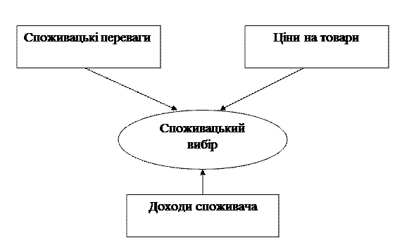 Рис. 2.1. Фактори споживацького вибору Зазначені зауваження дають достатньо підстав для побудови моделі споживацького вибору. Проте, ця модель, як і будь-яка інша, передбачає прийняття певних допущень, вихідних посилань, що дають змогу краще її зрозуміти та обмежують умови, за яких висновки, зроблені за її допомогою, будуть найвірогіднішими. Такими допущеннями є: 1. Здатність споживача ранжирувати альтернативи задоволення своїх потреб. Якщо є два набори товарів (А і В), то споживач може віддати перевагу якомусь з них або визнати, що вони для нього рівноцінні: