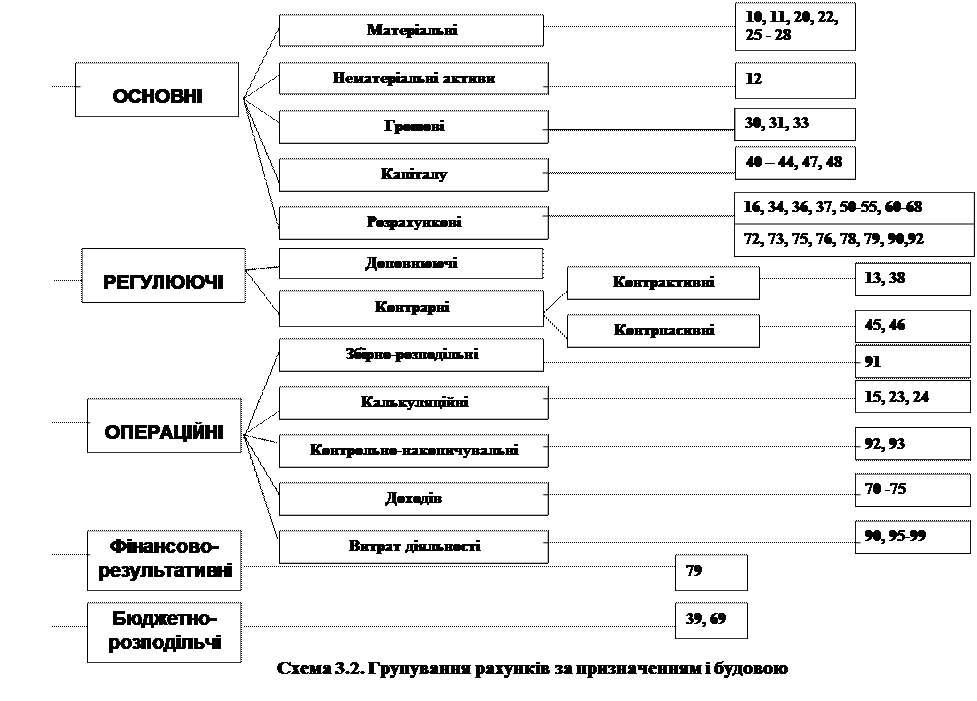 3. Класифікація рахунків Бухгалтерські рахунки є і носіями облікової інформації і знаряддям її одержання, накопичення з метою подальшого використанн для здійснення контролю, складання звітності, проведення аналізу. Насьогодні підприємства, установи і організації всіх організаційно-правових форм і форм власності (крім бюджетних установ і банківських структур) застосовують План рахунків бухгалтерського обліку активів, капіталу, зобовязань і господарських операцій підприємств і організацій, в якому передбачено понад 80 синтетичних рахунків. Це дає змогу рахунки з однаковими ознаками об’єднати у відповідні групи і з’ясувати, які показники можна отримати за допомогою такого групування. Рахунки класифікуються за різними ознаками: - за об’єктами обліку (відповідно до розділів активу і пасиву баланса); - за економічним змістом (для об’єднання рахунків у певні групи за їх економічною однорідністю, тобто залежно від того, що саме обліковується на цих рахунках); Оскільки об’єктами обліку є наявні засоби підприємства, господарські процеси та джерела утворення засобів, то й рахунки за їх економічним змістом цілком закономірно групуються за названими розділами. - за призначенням та побудовою (необхідно знати не тільки, що саме обліковується на відповідних рахунках, а й як це відображається, як формується відповідна облікова інформація. Рахунки ділять на основні, регулюючі, операційні, бюджетно-розподільні, фінансово-результативні. Класифікація рахунків наведена на схемах 1, 2, 3.