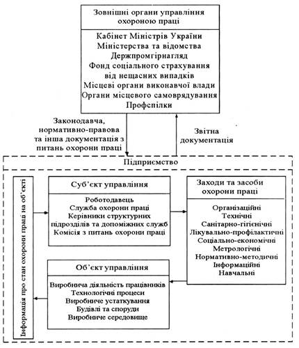 1.3. Комплексне управління охороною праці Держава створює законодавчу базу з питань охорони праці; комплекс інспекцій, що здійснюють нагляд за виконанням прийнятих нормативно-правових актів з охорони праці; інфраструктуру виробничо-технічного, інформаційного, наукового та фінансового забезпечення діяльності в галузі охорони праці. Роботодавець економічно зацікавлений в тому, щоб люди, які працюють на його підприємстві не травмувались та не хворіли, і тому забезпечує виконання нормативно-правових актів з охорони праці. Окрім того, механізм соціального страхування передбачає збільшення страхового внеску, якщо на підприємстві зростає травматизм та профзахворювання працівників. Істотне значення у системі управління охороною праці на підприємстві відіграють громадські інституції в особі профспілок, уповноважених трудових колективів та комісії з питань охорони праці. Працівники повинні відповідально ставитись до охорони праці, знати та виконувати вимоги, визначені нормативною документацією. В сучасних умовах кожному працівнику необхідно постійно підтримувати високий фізичний, психологічний та фаховий рівень, програмувати шляхи здорового довголіття, запобігати виникненню випадків травматизму та профзахворювань. Інакше у працівника буде значно менше шансів отримати роботу на ринку праці. Отже, у сучасних ринкових умовах лише комплексне управління охороною праці з боку держави, роботодавця та працівників здатне забезпечити підвищення ефективності у цій сфері. В той же час, як показала практика на підприємствах, окремі розрізнені заходи з охорони праці не дають необхідного ефекту, тому в даному питанні потрібний системний підхід, при якому заходи з охорони праці застосовуються продумано, взаємопов'язано, комплексно. З цією метою на підприємстві, з урахуванням його особливостей, розробляється система управління охороною праці. Система управління охороною праці (СУОП) – це сукупність органів управління підприємством, які на підставі комплексу нормативної документації проводять цілеспрямовану, планомірну діяльність щодо здійснення завдань і функцій управління з метою забезпечення здорових, безпечних і високопродуктивних умов праці, запобігання травматизму та профзахворювань, а також додержання прав працівників, гарантованих законодавством з питань охорони праці. Створення СУОП здійснюється шляхом послідовного визначення мети і об'єкта управління, завдань і заходів щодо охорони праці, функцій і методів управління, побудови організаційної структури управління, складання нормативно-методичної документації. В спрощеному вигляді будь-яку систему управління (керування) можна підрозділити на дві підсистеми: таку, що управляє і таку, якою управляють (рис. 1.4). В свою чергу, у системі управління виділяють об'єкт, яким управляють та орган, який здійснює таке управління. Останній, на основі аналізу отриманої інформації – зовнішньої (наприклад, наказу міністерства) або внутрішньої про стан об'єкта, розробляє і видає управлінську інформацію (наприклад, наказ по підприємству). Як правило, на великих та середніх підприємствах на підставі управлінської інформації деякий виконавчий орган (наприклад, керівники структурних підрозділів) здійснюють управлінську дію на об'єкт. У багатьох випадках орган, що здійснює упра