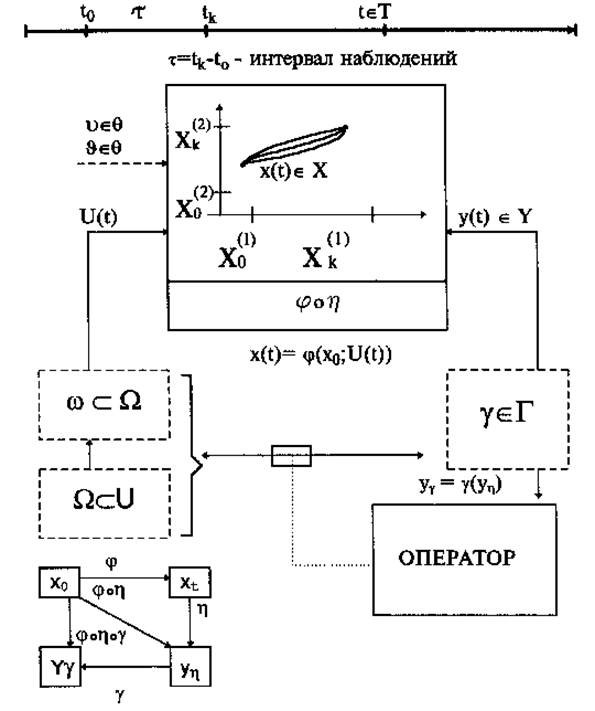 В общей теории систем динамическая система определяется в виде математической системы [25,с.339]: å = {T,X,V,W,Y,Г,h,j}, где А = {Т, X, V, W, Y, Г) - элементы системы (множества), R = {h;j } - отношения между элементами. Для содержательного определения составляющих А и R рассмотрим рис. 5.1, где: Т = {t0,...t;...tk} -множество моментов наблюдений по времени, от t0 (начало) до tk (конец) процесса; Х = {х0 = х(t0);...хk = х(tk)}-множество состояний объекта; V = {U}- область допустимых воздействий на объект; W Í V- область классов допустимых воздействий; w Ì W - отдельный класс (функция) воздействий, например, ступенчатая, гармоническая, линейная функция. Y = {y0;...yk} - наблюдаемая часть состояний объекта, YÌ X; Г = {g} -классы индуктивно-моделируемых систем, абстрактных и реальных моделей объекта наблюдений; j - система отношений, определяющая смену внутренних состояний объекта; h - система отношений, определяемая каналом наблюдений. Другими символами общая динамическая система определяется соотношением вида: j h g å: T * X * U * W ® X ® Yh ® Yg , т.е. в виде композиции отображений j о h о g. Упражнения 1. В приложении П.1 дано описание объекта физической природы - типа "прессдуктор". Требуется конкретизировать составляющие общей динамической системы на основе данного объекта наблюдений, а именно: - определить допустимые классы входных воздействий {w}; - предложить систему для описания пространства X - внутренних состояний объекта, например, используя понятие "петли намагничивания "; - определить классы индуктивно-моделируемых систем Уg, порождаемых системой накопленных знаний; - определить характер функций поведения Уh при различных классах входных воздействий; и другие элементы динамической системы согласно общей теории динамических систем (см.рис. 5.1). 2. На объект типа прессдуктор подано гармоническое воздействие. Результаты наблюдений представлены переменными: 2.1. Составить описание канала наблюдений, по которому могут быть получены данные пары переменных. 2.2. Определить конституэнты (постоянные и параметры) эксперимента, задаваемые наблюдателем. 2.3. Сформулировать систему предложений, которые необходимо выполнить при переходе от осциллограммы к табличной форме представлений данных [59]. Описать свойства канала наблюдений, необходимые для этого перехода. 2.4. Уточнить систему предложений для описания прессдуктора (см. п.2.3.) на основе учета математических свойств переменных при гармоническом классе воздействий: а) отсутствие постоянной составляющей и четных гармоник: Vi(t) = -Vi(t+0.5Т); Т - период сигнала;