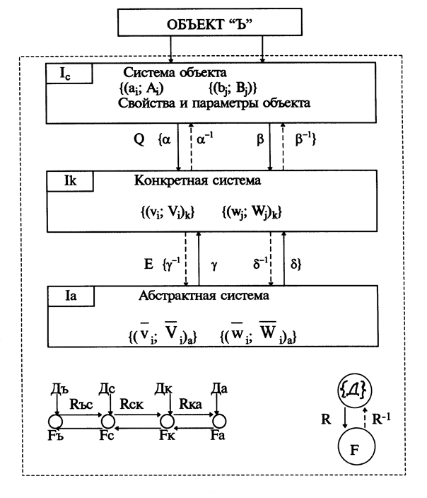Базис в обоих случаях определяется изначально как четкое соответствие. Обобщение получаемых данных ведется по каналу абстрагирования (g-1; d-1) и конкретизации (g; d): Е = ({gi: Для двухшаговой операции абстрактная система Ia определяется композицией функций: Ia = ({Аi; Особенность создания исходной системы I = (Ic;Ik;Ia) состоит в том, что она определяется на дометодологическом уровне, где человеческий фактор (интуиция, эвристика, логика) играют определяющую роль. Это творческий процесс порождения новых данных и задач,