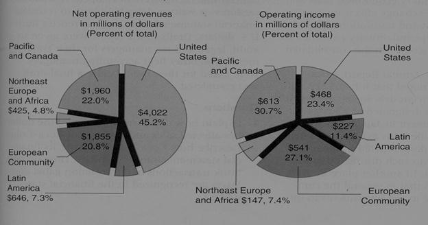 Figure 19.7 Although the United States is clearly the most important geographic area in terms of sales for Coca-Cola, the Pacific and Canada geographic segment provides a greater percentage of operating income than does any other geographic area. Source: 1987 Coca-Cola Annual Report.