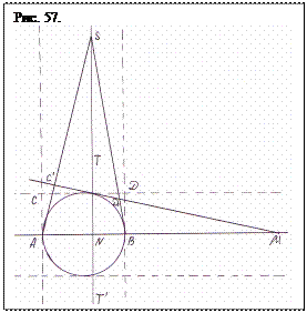 Перемещение полюса М из бесконечности в зону окружности не отражается на его новом качестве, оставляя ему значимость несобственной плотностной точки. Следовательно, и геометрия пространства, заключенного в промежутке ТМТ` должна некоторым образом отличаться от пространства евклидовой геометрии, поскольку вблизи окружности и в ней появились точки разного несовместимого качества. В целом крестообразная фигура, может быть названа проективным крестом, и имеет способность кадрировано изменяться (деформировать), так как точки опоры S и S 1 могут перемещаться в любую область пространства над базисной прямой, вызывая деформацию всей фигуры, заключенной в структуру пирамиды (кроме основания). Поскольку двойки параллельных прямых, касательных к окружности, пересекаются под углом 90о и проходят за ее пределы на бесконечность вверх и вниз, вправо и влево, то согласно Дезаргу, во всех четырех направлениях они на бесконечности пересекаются в несобственных точках М, М 1, S, S 1 и др., лежащих на базисной прямой и поляре, а образуемая ими в скрытой форме первичная фигура есть проективный крест (рис. 55.). Таким образом, фигура проективного креста представляет собой геометрическое единое. Все элементы ее взаимосвязаны и взаимообусловлены. Причем точки опоры серии S хотя и принадлежат фигуре и входят в целое, являются достаточно «самостоятельными» объектами и как бы «отделены» от окружности своей нейтральной зоной, проходящей внутри пирамид. То, что точка S способна «перемещаться» в любую область пространства, а не только по поляре, свидетельствует о том, что в любой области пространства существуют аналогичные плотностные точки, являющиеся невидимыми элементами пространства. И каждый элемент фигуры: точки, отрезки, пирамиды и т.д., являясь отдельным, обладает возможностью «самостоятельного движения», которое все равно будет происходить по законам движения единого. В современной проективной геометрии фигура как единое не рассматривается. Фигуру, несколько напоминающую проективный крест – окружность, с тремя вертикальными касательными, только повернутую на 90о, мы уже встречали при рассмотрении процесса деления отрезка в крайнем и среднем отношении. Это три параллельные на рис. 50, пересекающие бесконечную прямую АВ в точках А, В и N, только там прямая ТТ` проходила не через центр окружности. Эти параллельные перенесены на рис. 55 и отмечено, что точка N в этом случае оказывается проекцией прямой ТТ´ на диаметр, а сама прямая – полярой, которая может перемещаться по диаметру от точки В к центру окружности вызывая перемещение полюса М, образуемого касательными, от точки В вправо от окружности. То же самое происходит при перемещении поляры от точки А с левой стороны фигуры вправо, где аналогом точки М становится точка М 1. Перемещение поляры в промежутке между точками А и В вызывает асимметрию пирамид и сопровождается пропорциональным перемещением касательных к окружности ТТ ´, а вместе с ними и образуемых ими полюсов. При перемещении к окружности полюса серии М остаются несобственными точками еще и потому, что они перемещаются по несобственной базисной прямой. Еще раз остановимся на элементах, образующих проективный крест на плоскости. Основу его составляет окружность, пересекаемая бесконечной базисной прямой на которой отрезок АВ является д