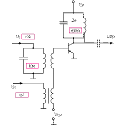 Рис.4.14 пример транзисторного преобразователя частоты Выводы: 1. При преобразовании частоты закон модуляции входного сигнала не нарушается, а изменяется только значение центральной частоты спектра сигнала. 2. Для преобразования частоты используются нелинейные цепи и цепи с периодически изменяющимися параметрами. 3. В нелинейных цепях под действием сигнала гетеродина (интенсивного по отношению к сигналу) периодически во времени меняется режим преобразовательного элемента, т. е. крутизна его ВАХ меняется с частотой гетеродинного U. При этом на выходе преобразовательного элемента содержится ряд комбинационных составляющих, одна из которых обычно с частотой (ωс-ωг) выделяется полосовым фильтром.