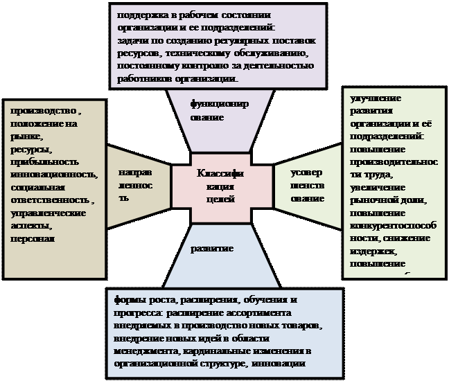 Классификация целей организации обеспечивает руководство действенным инструментом стратегического и оперативно-тактического управления. Цели классифицируются · по направленности, · по функционированию, · по усовершенствованию, · по развитию (Рис.2.20).