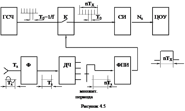Измерение периода электрических колебаний Tx осуществляется путем квантования одного или нескольких (n) измеряемых периодов известными интервалами времени Т0. Технически это осуществляется путем подсчета с помощью СИ числа импульсов с периодом Т0, которые уложатся в один или в n измеряемых периодов Тх. Структурная схема ЦЧ для режима измерения периода, т.е. измерителя периода, изображена на рис. 4.5.