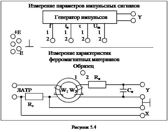 Описание лабораторной установки В состав лабораторной установки входят: электронный осциллограф С1–83, лабораторный макет, ЛАТР и источник питания напряжением ±12 В. Инструкция по включению осциллографа с описанием органов управления им расположена на рабочем месте. Лабораторный макет (рис. 5.4) подключается к источнику питания через клеммы «+12 В», «^», «–12 В», расположенные с левой стороны передней панели. В верхней части панели расположен генератор импульсов с выходными гнёздами У, параметры импульсов устанавливаются четырьмя переключателями f, tи, τ, Um, которые соответственно изменяют частоту, длительность импульса, длительность фронта (среза) импульса, его амплитуду. В нижней части панели расположено устройство для измерения характеристик ферромагнитных материалов. Клеммы «ЛАТР», расположенные с левой стороны макета, предназначены для подключения выходного напряжения ЛАТРа к макету. Гнёзда У и Х служат для подключения устройства соответственно ко входам У и Х осциллографа.